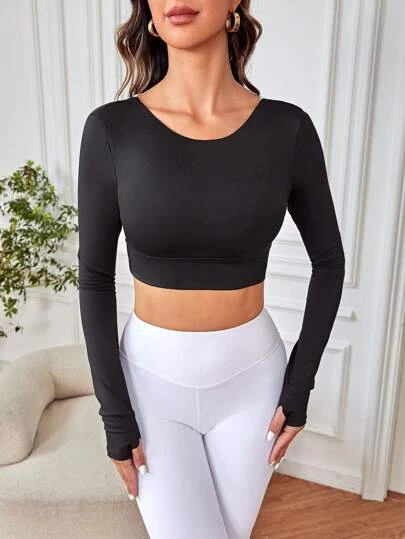 Thumb Holes Waist Tie Slim Fit Crop Top Workout Yoga Long Sleeve T-shirt