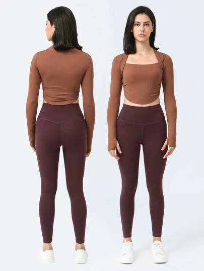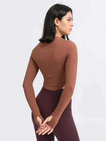 Thumb Hole Back Tie Waist Slim Fit Crop Yoga Top With Long Sleeves