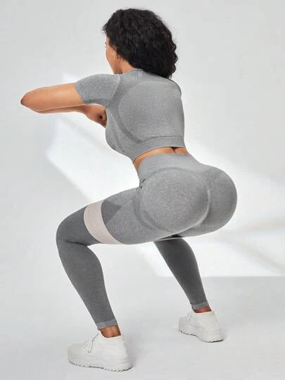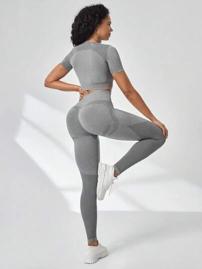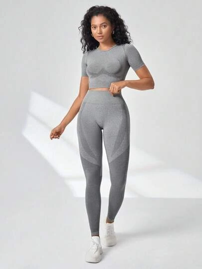 Yoga Basic 2pcs Yoga Set Athletic Suit Raglan Sleeve Crop Tee & Hip-hugging Leggings