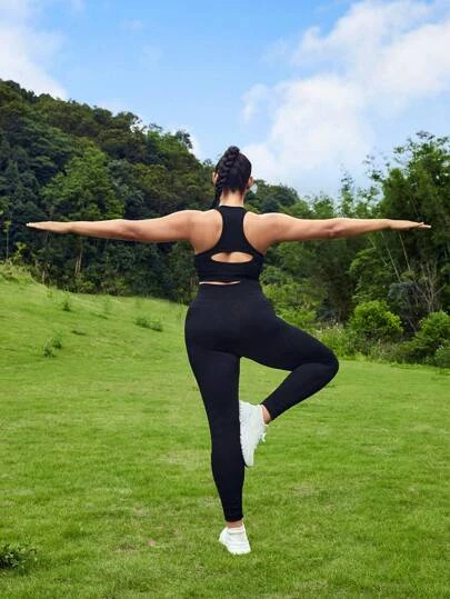 SHEIN Leisure Plus Hollow Out Wideband Waist Sports Leggings